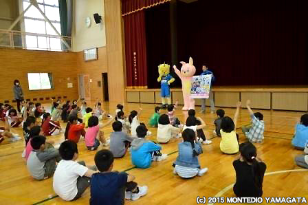 続いてはGW明けの5月7日(木)ディーオは朝日町の大谷小学校へ朝日町応援デーのPRへ行ってきました。この日は朝日町のキャラクター「桃色ウサヒ」がPRの手伝いに来てくれました!