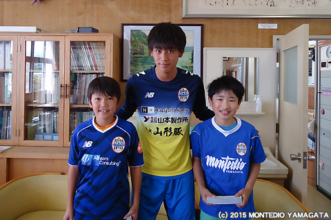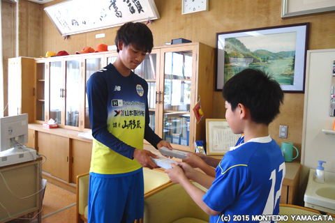 明日5月23日(土)に行われる2015明治安田生命J1リーグ 1stステージ第13節vs.ヴィッセル神戸戦。県民応援デーを盛り上げようと20日に天童市内の小中高校へ行き、児童と生徒に招待券を贈り来場を呼び掛けました。