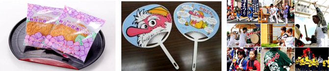 新庄市では、場外売店であじさいせんべいの販売や、かむてんうちわ等のかむてんグッズを販売いたします。かむてんは、新庄市出身で「幽☆遊☆白書」「HUNTER×HUNTER」などのヒット作を手掛けた冨樫義博さんが平成6年に誕生させたキャラクター。新庄市に伝わる〝神室山の天狗〟がモチーフで、長い鼻と白いヒゲがトレードマークです。その他、15時15分ごろからは、中央広場のふれあいステージにて新庄まつりで演奏される新庄囃子が披露されます。