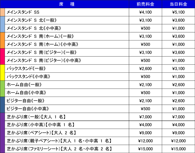 - メインスタンドSS席は、一般・小中高生共通の料金です。