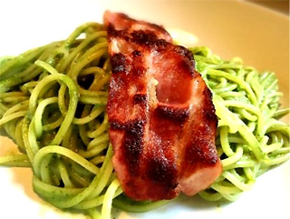 ほうれん草とバジルの濃厚なソースのパスタ。上に薄切りの肉をのせるのが定番。今回はベーコンを載せました!