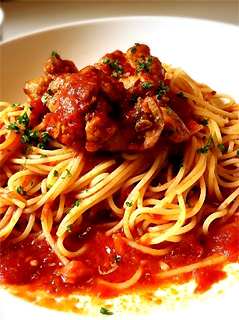 骨付きチキンを多めにニンジン、パプリカなどが入ったトマトソースで煮込みパスタのソースにしました。日本でもお馴染みのミートソースに似ています。