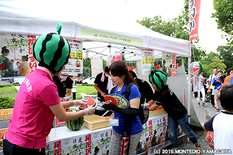 キックオフは19時30分と遅い時間でしたが、皆様に来場頂く時間にはまだまだ強い日差しが残っています。そんな暑さの中、嬉しいのはJAみちのく村山様による尾花沢すいかのふるまい。暑くなった体を冷ますだけでなく試合に向けてのパワー注入にもなります。