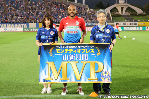 ピッチ内ウォーミングアップ前、6月の山形新聞月間MVP賞の表彰が行われました。選ばれたのは6月の3試合で2ゴールを決めたディエゴ選手です。