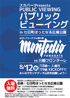 8月12日(水)に七日町ほっとなる広場公園(山形市)にて、2015明治安田生命J1リーグ2ndステージ第6節 川崎フロンターレvs.モンテディオ山形のパブリックビューイングを行います。商店街から屋台の出店などが行われます。山形市中心街でのパブリックビューイングをぜひ家族や友人と楽しんでいただき、アウェイの地で戦う選手たちに熱い声援をお送りください。