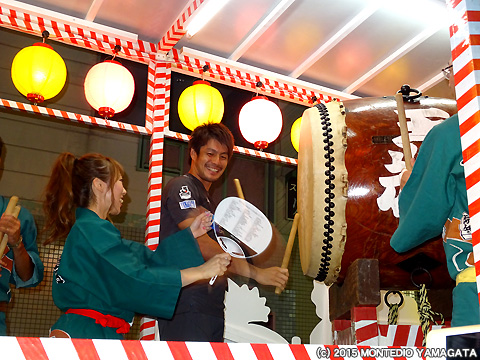 中村隼選手、瀬川選手は天童市の山車の上から祭を盛り上げます。