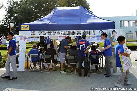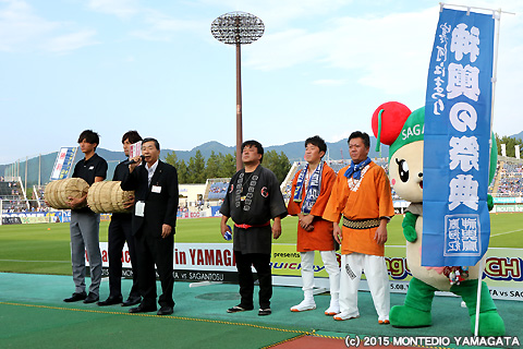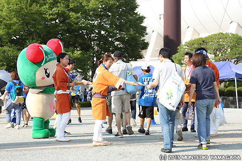 この試合は山形市と寒河江市の応援デーとして開催されます。それぞれたくさんの方にNDスタにお越し頂いたほか、特設ブースを設置頂き、キュウリ漬けの振る舞いや山形まるごとマラソンのPR、自慢の寒河江やきとりの販売や寒河江まつり「神輿の祭典」のPRを行って頂き、スタジアムを大いに盛り上げて頂きました。