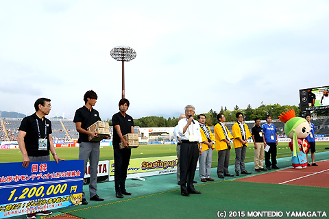 山形市の市川昭男市長にスタジアムまでお越し頂き、それぞれ激励と募金や応援品の贈呈を頂きました。