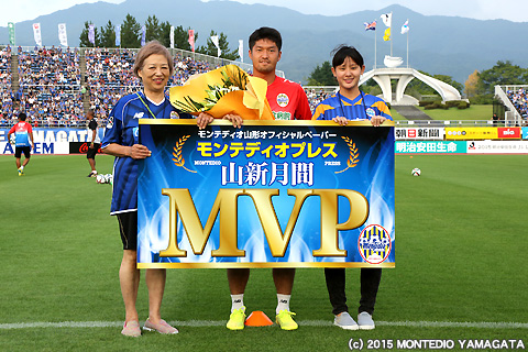 ピッチ内ウォーミングアップ前、7月の山形新聞月間MVP賞の表彰が行われます。選ばれたのは、1stステージはなかなか出場機会に恵まれなかったものの、2ndステージに入ってからはスタメンでの出場を続け、中盤でチームを牽引する宮阪政樹選手です。