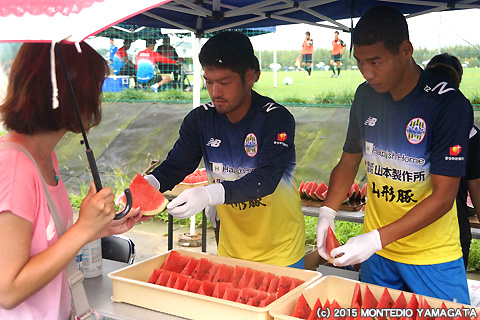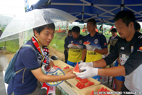 この日は福島ユナイテッドFCとのトレーニングゲーム。昨日の鳥栖戦の先発メンバーを中心に、トレーニングゲームに出場しなかった選手たちがハーフタイムにサポーターのみなさまと触れ合いながら尾花沢スイカをふるまいました。