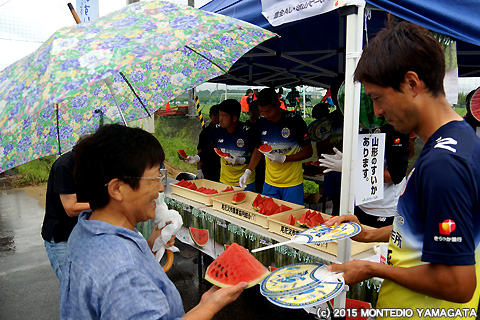 本日8月17日午前、JAみちのく村山様、JA全農山形様のご協力を頂き、山形県総合運動公園内の第3運動広場にてスイカのふるまいを行いました。