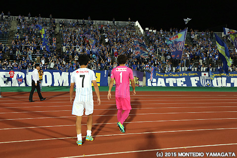 試合後、モンテディオ山形のサポーターが待つゴール裏スタンドに向かう、カマタマーレ讃岐の二人の選手。大きなコールで迎えられます。
