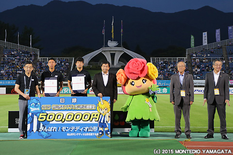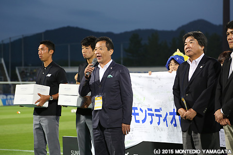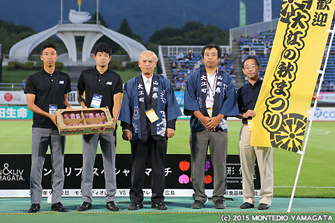 この試合の市町村応援デーの対象市町村は「上山市・村山市・西川町・大江町」の4市町。いつも熱いご声援を頂いておりますが、この試合では各市町の特産品や応援募金の贈呈を頂きます。