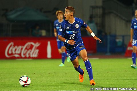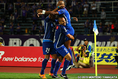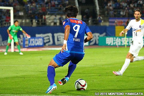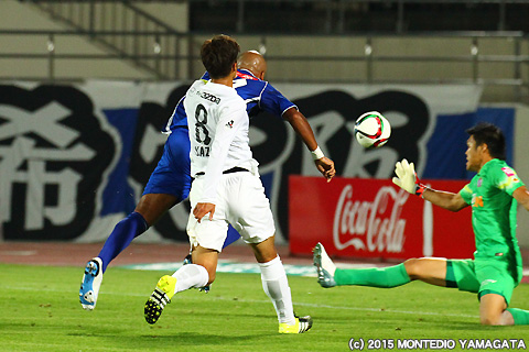 さて試合を先に動かしたのはモンテディオ山形です。前半35分、ロメロフランク選手からのパスを受けたディエゴ選手が相手ゴールキーパーを見ながら巧みに流し込みゲットゴール!