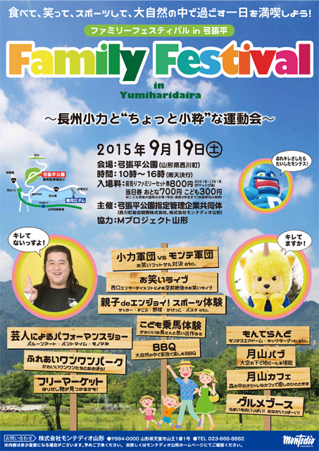 2015年9月19日(土)に山形県西川町の月山弓張平公園で開催される「ファミリーフェスティバルin 弓張平」へ、モンテディオ山形の選手参加が決定しましたのでお知らせします。