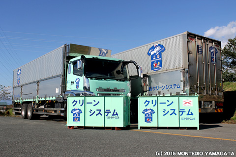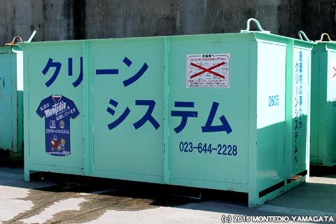 弊社正会員の株式会社クリーンシステム様では、弊社のチームロゴやマスコットが入ったユニフォーム型のステッカーを社有車(廃棄物の取集運搬車両)約30台とコンテナ(廃棄収集)約100台に貼っていただき、県内外へモンテディオ山形を宣伝していただいております。