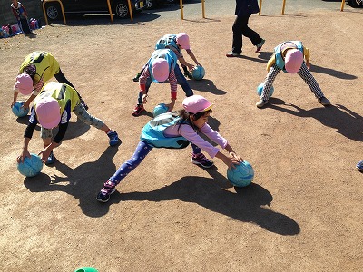 ボールをころころ~、しっかり足を広げて膝もまっすぐね~!