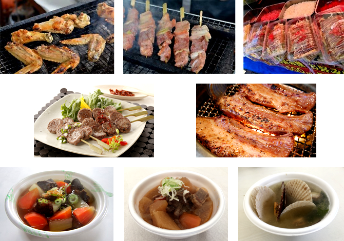 | (有)マルトウ畜産 | 広島風お好み焼き、オム焼きそば、ジャンボやきとり、ジャンボ牛串、仙台モツ煮 | 300~500円 |