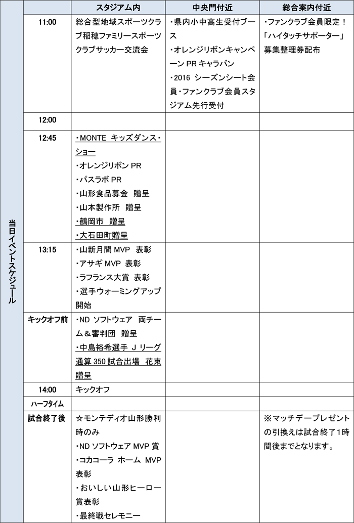 2015明治安田生命J1リーグ2ndステージ第16節モンテディオ山形VS.清水エスパルスの開催概要を、次の通りお知らせいたします。下線部が追加・変更部分となります。