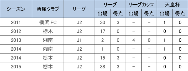 三上JSC→野洲中→野洲高→同志社大→横浜FC→栃木SC→湘南ベルマーレ→栃木SC→湘南ベルマーレ→栃木SC