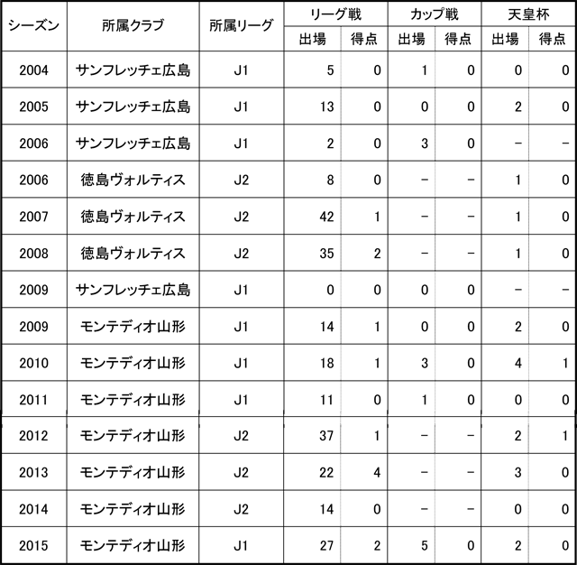 沼田高→広島修道大→サンフレッチェ広島→徳島ヴォルティス→サンフレッチェ広島→徳島ヴォルティス→サンフレッチェ広島→徳島ヴォルティス→サンフレッチェ広島→モンテディオ山形→サンフレッチェ広島→モンテディオ山形