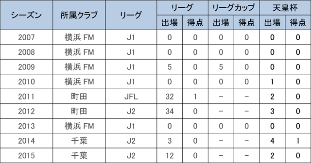 鷹の子SC →横浜F・マリノスプライマリー菅田 →横浜F・マリノスジュニアユース→横浜F・マリノスユース→横浜F・マリノス→FC町田ゼルビア→横浜F・マリノス→ジェフユナイテッド千葉