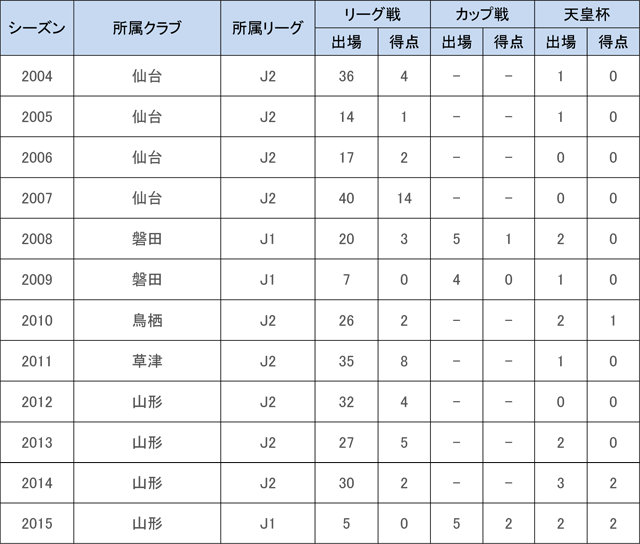 福島東高→ベガルタ仙台→ジュビロ磐田→サガン鳥栖→ザスパ草津→サガン鳥栖→モンテディオ山形