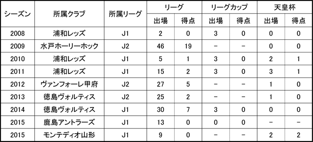 結城サッカースポーツ少年団→八千代第一中→古河第三高→駒澤大→浦和レッズ→水戸ホーリーホック→浦和レッズ→ヴァンフォーレ甲府→徳島ヴォルティス→鹿島アントラーズ→モンテディオ山形