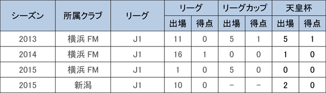 しらとり台FC→横浜F・マリノスプライマリー→横浜F・マリノスJrユース→横浜F・マリノスユース→国士舘大→横浜F・マリノス→アルビレックス新潟→横浜F・マリノス