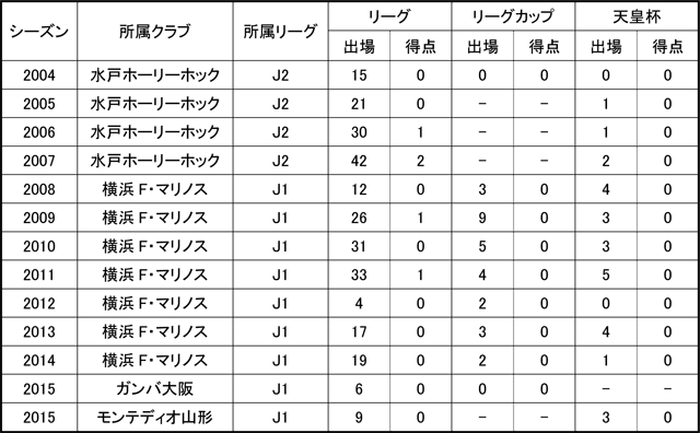 三山小→ウイングスSS習志野→修徳高→水戸ホーリーホック→横浜F・マリノス→ガンバ大阪→モンテディオ山形