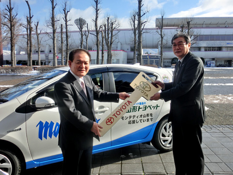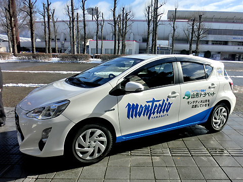 モンテディオ山形では、弊社正会員の山形トヨペット様より、広告協賛いただいたロゴカーの贈呈いただきました。贈呈いただくアクアは営業活動や宣伝活動など、弊社の活動における様々なシーンを通じて、山形トヨペット様をPRいたします。