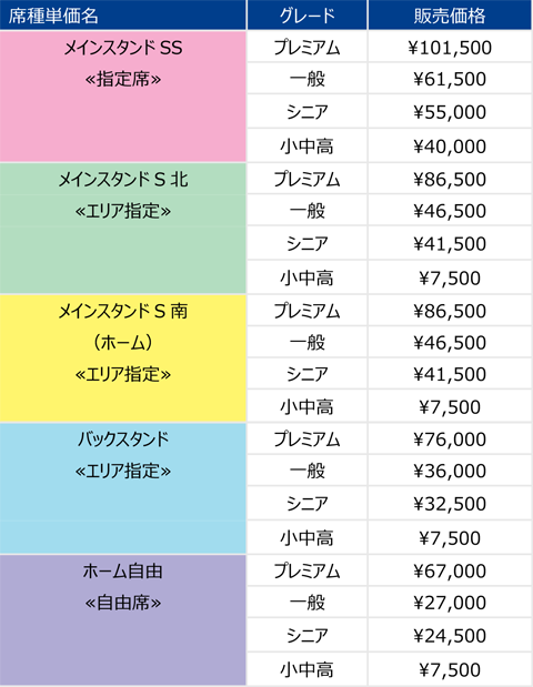 2016シーズンシート 座種・料金: