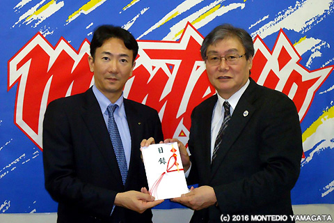 2月10日、モンテディオ山形クラブスポンサーの山形銀行様より、昨年よりお取扱い頂きました【モンテディオ山形サポーターズ定期預金2015】の寄付金を贈呈いただきました。