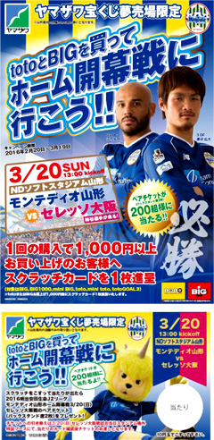 このたび、山形県内ヤマザワ宝くじ夢売り場にて、2月20日(土)から3月19日(土)までの期間にtoto、又はBIGをご購入いただいたお客様を対象にホーム開幕戦のペア招待券(バックスタンド席)が当たるスクラッチキャンペーンを実施いたします。是非、お買い求めください。