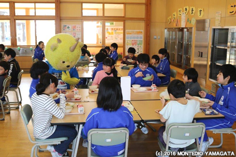 まずは、2月22日(月)遊佐町立藤崎小学校での食育活動での様子についてレポートいたします。食育の授業を行う前に、まずはみんながお昼の給食を食べているランチルームにサプライズで登場!