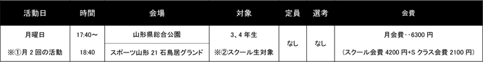 ※(1)Sクラス村山U-10の活動は、月2回活動を行います。3年生・第一、第三月曜日 4年生・第二、第四月曜日(予定)