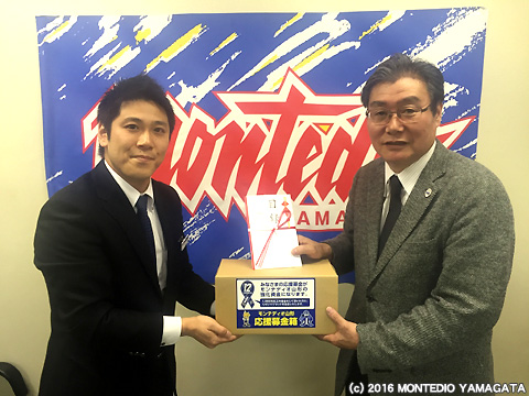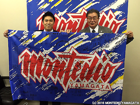 また、2月25日から3月1日に開催されたモンテディオ山形パネル展で、来場者の皆様から応援メッセージを書いていただいたフラッグも贈呈いただきました!