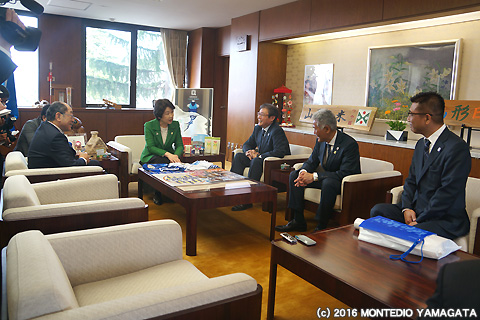 公開日 2016.03.18 山形県吉村美栄子知事への表敬訪問 本日2016年3月18日、弊社社長森谷俊雄、取締役中井川茂敏、石﨑信弘監督が山形県庁を表敬訪問いたしました。 吉村美栄子山形県知事からシーズンに向けての激励を頂くとともに、ホーム開幕に向けての決意を新たにいたしました。 いよいよ、ホーム開幕。モンテディオ山形は新たなシーズンを山形を愛する全ての皆様と共に戦ってまいります。ひとりでも多くの方のスタジアムへのご来場を心よりお待ちしています。 #ホーム ニュース一覧