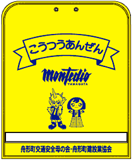 舟形町のご当地キャラクターのめがみちゃんとモンテディ山形マスコットディーオが舟形町の子供の安全を見守るというイメージでデザインされています。