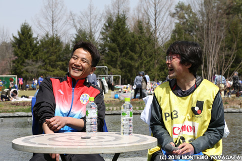 もんてらんど パフォーマンスステージでモンテディオ山形を熱く語る「モントーーク!」トークゲストは、モンテディオ山形を最もよく知るフリーライター・佐藤円さんと、2000年から7シーズンに渡って在籍し、そのキレのあるドリブルでサポーターを大いにわかせた、永井篤志さんです。