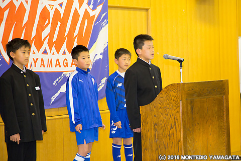 「僕達モンテディオ山形ジュニア村山は、チーム一丸となって、どんな苦労を乗り越えられるよう頑張ります。練習の時も精一杯力を出して頑張りたいです。」