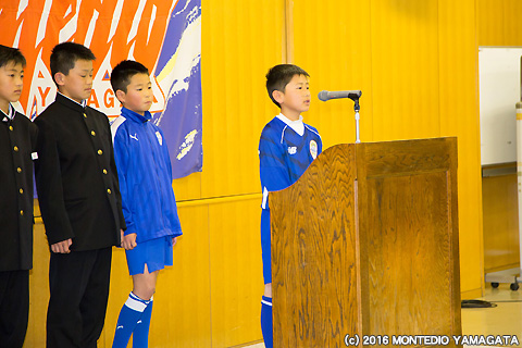 「僕達モンテディオ山形ジュニアユース庄内は日頃の練習から競争心を持ち、全力で取り組み、試合ではいい内容で試合をし、勝ちにこだわり、全国大会優勝を目指して頑張ります。生活面では、人間としてあたりまえのことをしっかりし、規則正しい生活を送ることを誓います。」