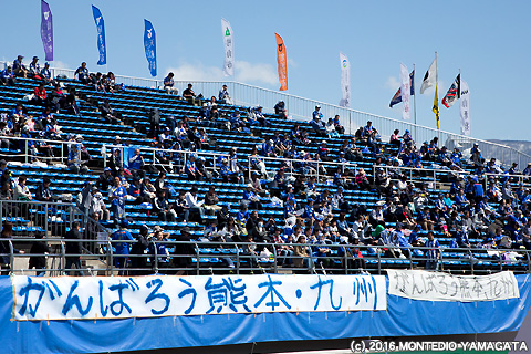 熊本県を中心に続く地震による甚大な被害により、たくさんの方々が被災され、Jリーグでも今週末に予定されていた試合のうち、J1・J2・J3合わせて6試合が中止となりました。試合開始前にはスタジアムを訪れたすべての方と、犠牲になられた方への黙祷を行い、また中央エリア募金ブースでは、モンテディオ山形選手も参加して被災者救済と被災地の復旧、復興に向けての救援金募金活動を実施しました。改めて犠牲になられた方々に心よりご冥福をお祈りし、また被災されている方々のご無事をお祈り申し上げます。また募金活動にご協力を頂きましたたくさんの皆様に御礼を申し上げます。
