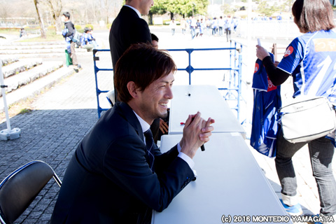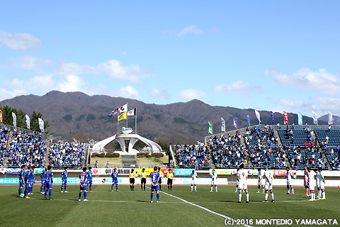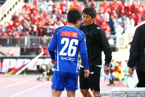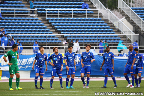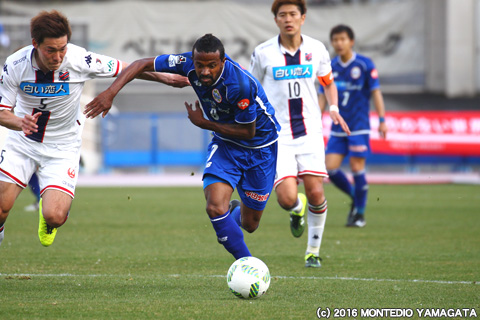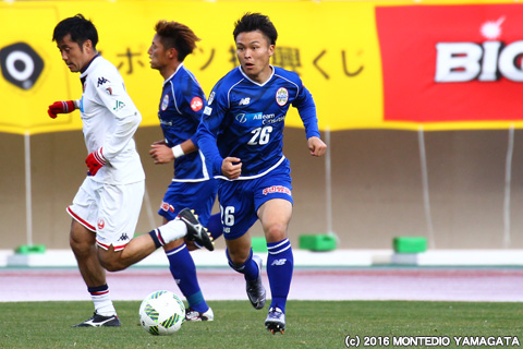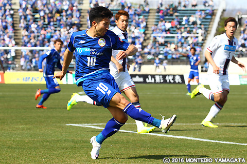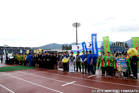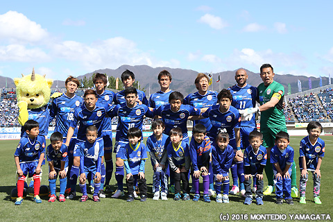 こ の試合、宇佐美宏和選手とアルセウ選手が出場停止となっているため、スタメンは前節FC町田ゼルビア戦から4人が代わっています。ディフェンスラインに 入った田代真一選手はこれがモンテディオ山形の選手として初の試合出場、中盤の伊東俊選手と汰木康也選手は今季初のスタメン、そして大黒将志選手もスタメ ンに戻っています。またサブでは、瀬川和樹選手と高卒ルーキー永藤歩選手が同じく今季初のメンバー入りとなっています。