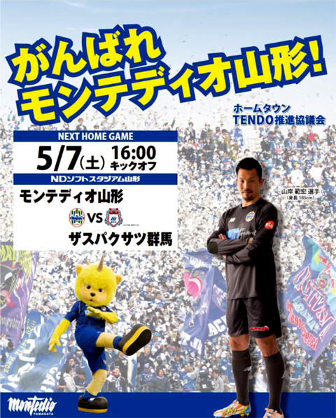 『天童市応援デー』として2016年5月7日(土)に開催される、2016明治安田生命J2リーグ第12節 ザスパクサツ群馬戦に向けて、弊社代表取締役社長の森谷俊雄が天童市長への表敬訪問を行い、天童市役所職員全員の観戦要請を致します。また、この日に合わせ天童市役所の入り口にモンテディオ山形ホームゲーム日程告知パネルを設置し、そのお披露目式も行いますので合わせてお知らせします。