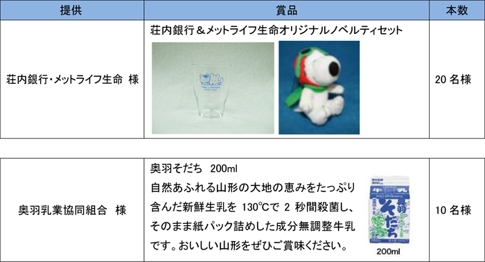 荘内銀行・メットライフ生命特設ブースに荘内銀行イメージキャラクター「タマちゃん」、メットライフ生命ブランドアンバサダー「スヌーピー」が来場し、ファンサービスを行います。また抽選で20名様にタマ収納ボックスをプレゼントいたしますので、是非ご参加ください。