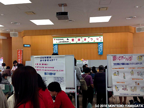 会場となった山形県看護協会会館には、血圧や体組成、骨密度、血管年齢などの測定コーナーや、リハビリ体操・妊婦疑似体験、赤ちゃんとのふれあいなどの各種体験コーナーなどが設置され、たくさんの来場者でいっぱいす。
