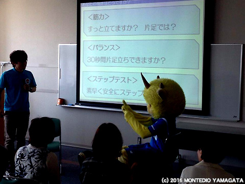 会場へ着いたディーオは健康づくり体操コーナーへ、まずは怪我の予防について講義を受けます。高齢社会となる現代において、転倒による怪我が増えているようで、転倒は自宅でも起こり得ます。転倒による歩行機能の低下によって、要介護となる割合が年々増加しているようです。