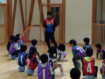 次はシュート対決です。上手にシュートするためにみんなコーチのお話を集中して聞きます。