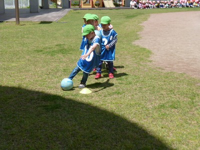 ボールと一緒にドリブルから笛の合図でピタッと止まります。